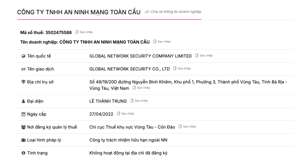 - Tên đầy đủ (Pháp lý): CÔNG TY TNHH AN NINH MẠNG TOÀN CẦU