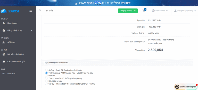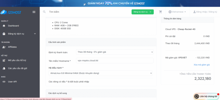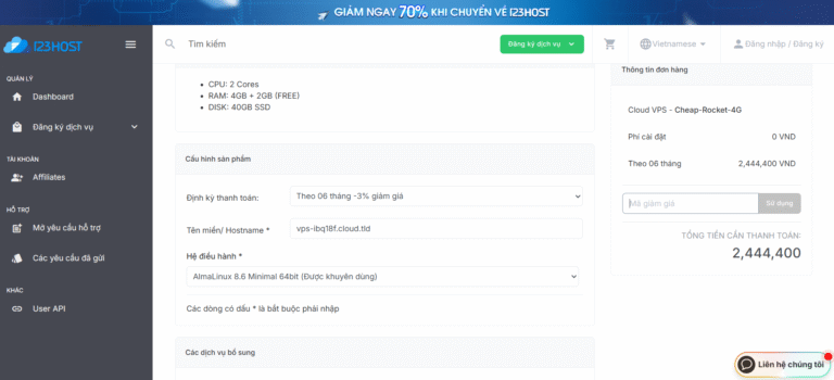 Bước 4 Nhập mã giảm giá: Tại bước thanh toán, bạn sẽ thấy một ô dành cho “Coupon/Mã khuyến mãi”. Đây là lúc bạn nhập chính xác mã giảm giá bạn có. Ví dụ, nếu bạn đang tìm kiếm ưu đãi cho Hosting, hãy nhập HOSTING70; cho VPS, có thể là VPS70; và đặc biệt, nếu quan tâm đến bảo mật, hãy thử VPSVIETANTIDDOS.