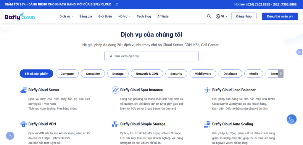 - Giải pháp toàn diện: Bizfly Cloud cung cấp hơn 20 dịch vụ chuyển đổi số, bao gồm các sản phẩm cốt lõi như Bizfly Cloud Server, Bizfly Cloud VPS, Bizfly Load Balancer, Bizfly Anti DDoS, Bizfly WAF, Bizfly Drive, cùng nhiều dịch vụ khác như CDN, Business Email, Simple Storage, VPN, Container Registry. Sự đa dạng này giúp doanh nghiệp có thể tìm thấy mọi thứ cần thiết để xây dựng và vận hành hệ thống mạng của mình tại một nơi duy nhất.