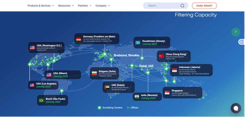 StormWall tự định vị mình là một nhà cung cấp giải pháp bảo vệ DDoS chuyên nghiệp, sở hữu một hạ tầng mạng lưới toàn cầu mạnh mẽ. Họ tuyên bố dung lượng lọc vượt trội với hơn 5.000 Gbit/s, phân bổ trên nhiều điểm hiện diện (POP) chiến lược khắp thế giới, bao gồm các địa điểm tại Kazakhstan, Trung Quốc (Hồng Kông), Indonesia, Singapore, UAE (Dubai), Bulgaria (Sofia) và Hoa Kỳ (Washington D.C.).