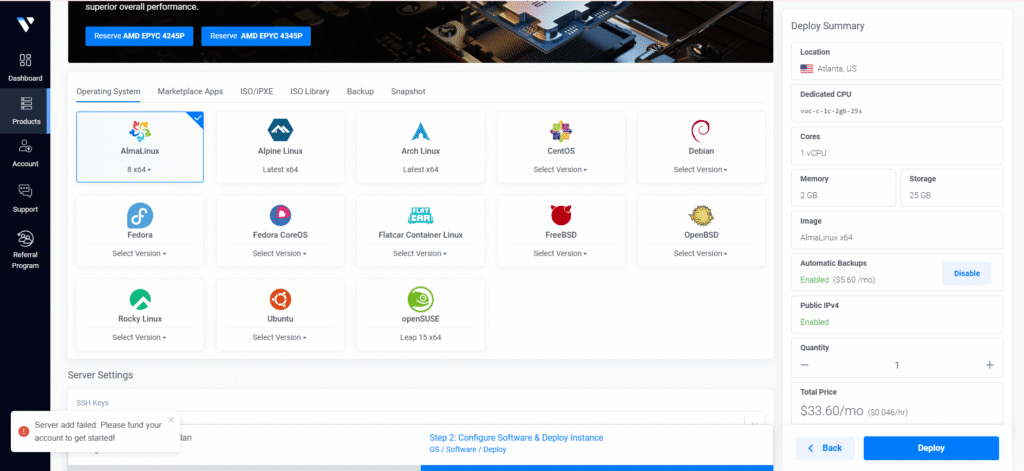 Bước 5: Hoàn tất quá trình thanh toán hoặc xác nhận. Máy chủ của bạn sẽ được triển khai chỉ trong vài giây, sẵn sàng để bạn bắt đầu cấu hình và sử dụng.