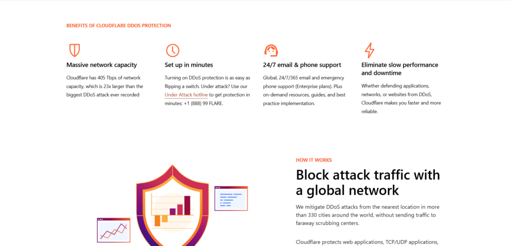 Cloudflare sở hữu một mạng lưới khổng lồ với dung lượng lên tới 405 Tbps, lớn hơn gấp 23 lần cuộc tấn công DDoS lớn nhất từng được ghi nhận. Khả năng này cho phép họ hấp thụ và giảm thiểu các cuộc tấn công quy mô lớn mà không làm ảnh hưởng đến hiệu suất của khách hàng.