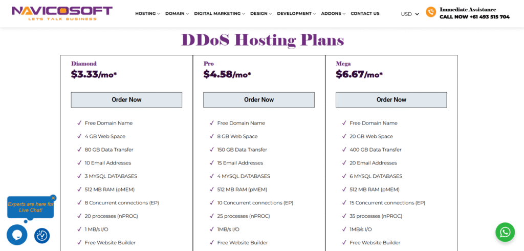 Navicosoft cung cấp 5 gói DDoS Protected Hosting chính (Diamond, Pro, Mega, Bronze, Unlimited).