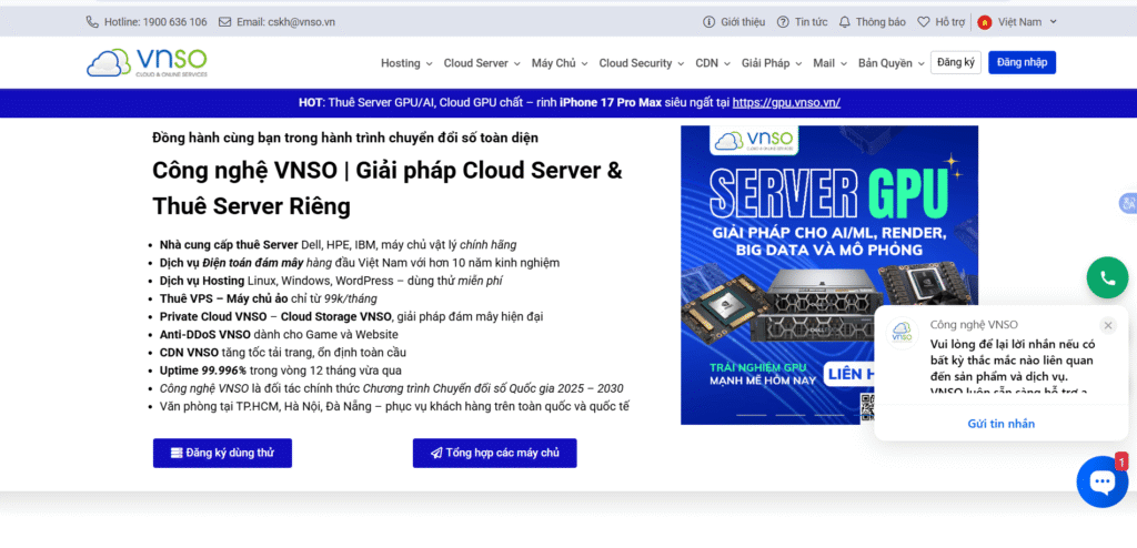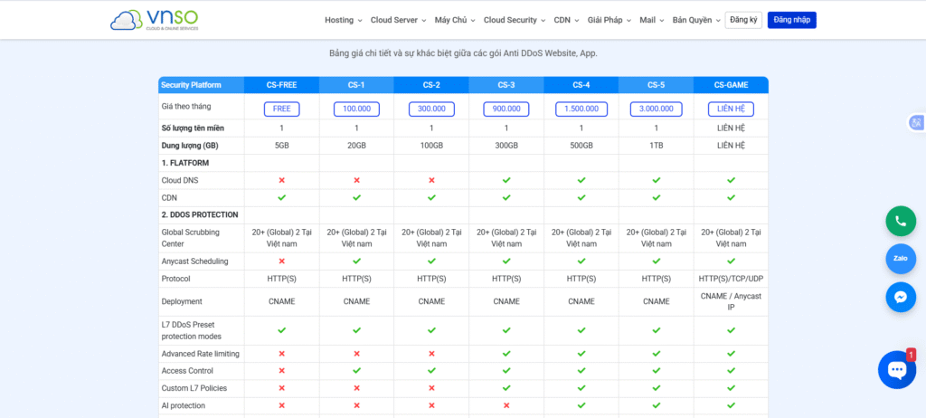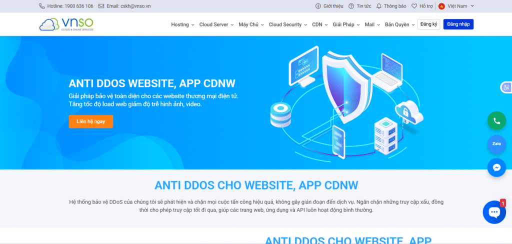 Họ cũng cung cấp hạ tầng hosting và VPS hiệu năng cao với mức giá cạnh tranh, cùng các tính năng hữu ích như cPanel và sao lưu hàng ngày. Mặc dù có những hạn chế về ngôn ngữ hỗ trợ và thời gian dùng thử, VNSO vẫn là một lựa chọn toàn diện và giá trị cho các doanh nghiệp muốn bảo vệ hệ thống trực tuyến của mình. Nếu bạn cần thêm tư vấn, đội ngũ Chống DDoS luôn sẵn sàng hỗ trợ.