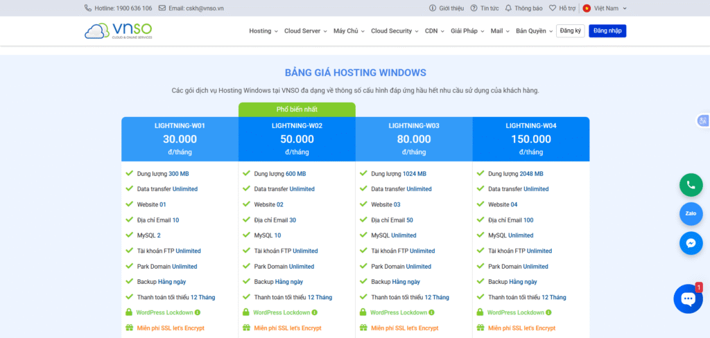 • WordPress Hosting: Các gói như LIGHTING-01 đến LIGHTING-04 cung cấp dung lượng lưu trữ từ 300 MB đến 2048 MB, băng thông không giới hạn, với mức giá khởi điểm chỉ từ khoảng 31.766 VNĐ/tháng.